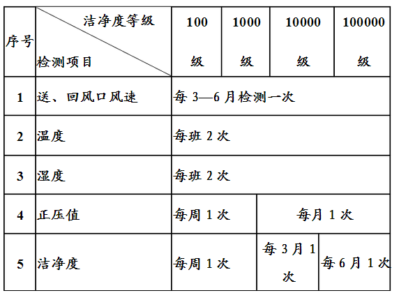 1、認真做好潔凈空氣環境參數的檢測,分別做好記錄。 2、潔凈空氣環境參數檢測項目及周期如下表所示。 必要時進行潔凈室空氣有害氣體成分的檢測和分析。
